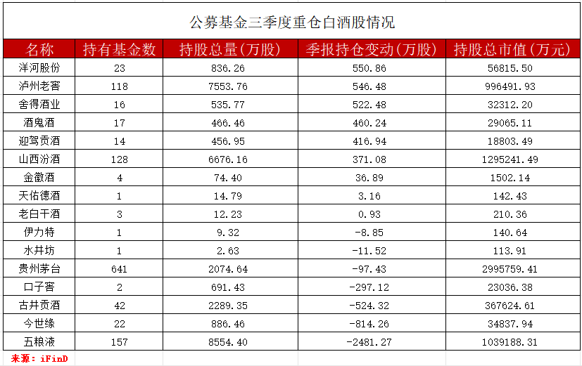 从公募基金三季报的重仓情况来看,洋河股份、泸州老窖(000568)、舍得酒业(600702)等9只白酒股获得增持;而五粮液、今世缘(603369)、古井贡酒等7只白酒股被减持;顺鑫农业(000860)、金种子酒(600199)、皇台酒业(000995)、*ST岩石等4只白酒股则未出现在公募基金重仓股名单中。